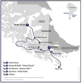 inklusiver 5-tägige Exkursion-Kreuzfahrt durch Patagoniens Fjorde Punta Arenas – Ainsworth-Bucht – Tuckers-Eilande – Pia-Gletscher – Gletscher-Allee – Kap Hoorn – Wulieia-Bucht – Ushuaia